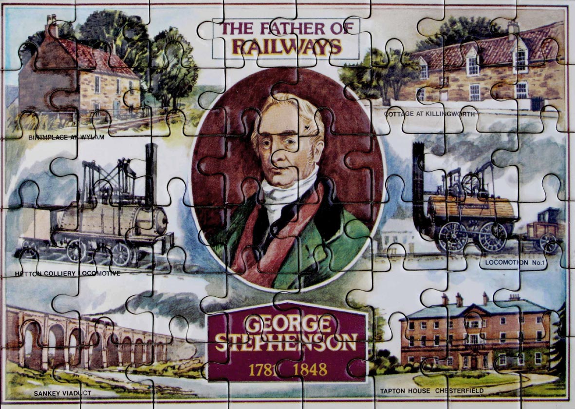 a 48-piece example commemorating this extraordinary man who began working with his father, at Dewley Collliery in north east England, when he was 14. At 19 he was building his first railway at nearby Hetton Colliery. The rest, they say - from locomotives Locomotion No.1 (Stockton & Darlington Railway) to Rocket (Liverpool & Manchester Railway) - is history. Surrounding a central, oval portrait of George Stephenson are the following – his birthplace at Wylam, Northumberland; later residences at a cottage at Killingworth and Tapton House, Chesterfield; a Hetton Colliery locomotive; Locomotion No.1; Sankey Viaduct. Both artist and manufacturer are unknown to me. Although historical in context and highly collectible, this puzzle is extremely small. My copy is in a wrapper, not a box. If anyone has any information about this puzzle please let me know (email address above). In my view, more puzzles should be dedicated to the work of George and Robert Stephenson. This remarkable father and son duo were responsible for much of the civil and mechanical engineering involved in the birth of railways from the early 19th century.